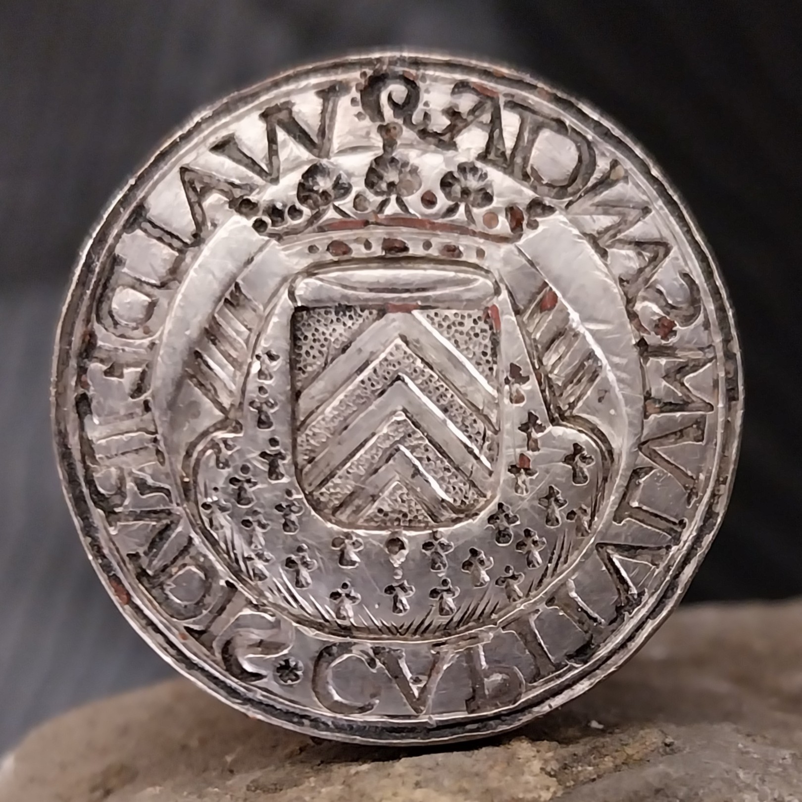 Un méreau, jeton de présence en cuivre, du Chapitre (1581) fait partie des collections du Trésor. Sur l’avers est représenté le blason aux « trois chevrons » sommé d’une couronne et fixé sur une crosse, entouré de la légende : « COMPTES ET GETTES IUSTEMENT », tandis que le revers porte un bras armé d’un glaive (un sénestrochère) entouré de la légende : « CRAINDANT LE DIVIN IUGEMENT »[ii].