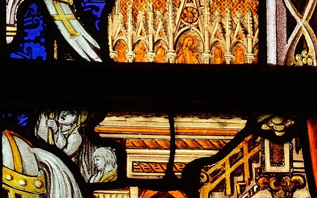 Ensuite, le blason « de sainte Waudru » se retrouve sur la verrière centrale de la partie haute du chœur (une crucifixion vers 1510/1511) mais sous forme de bannière sur hampe tenue par un lion portant devant lui l’écu aux armes du Hainaut.